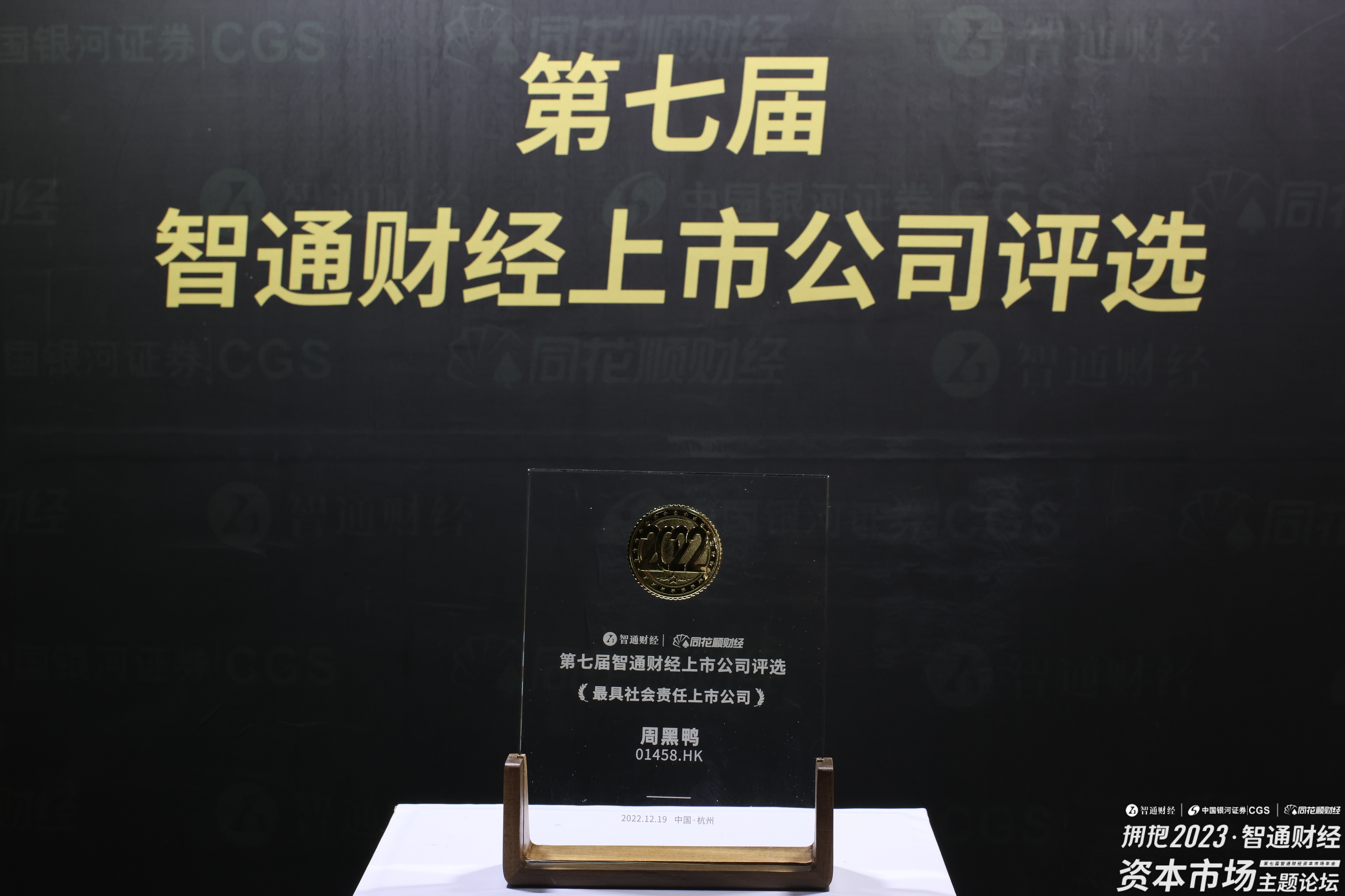 2022年12月19日上午12点,在杭州举办的“第七届智通财经上市公司评选”上,周黑鸭(01458)荣获“最具社会责任上市公司”大奖。