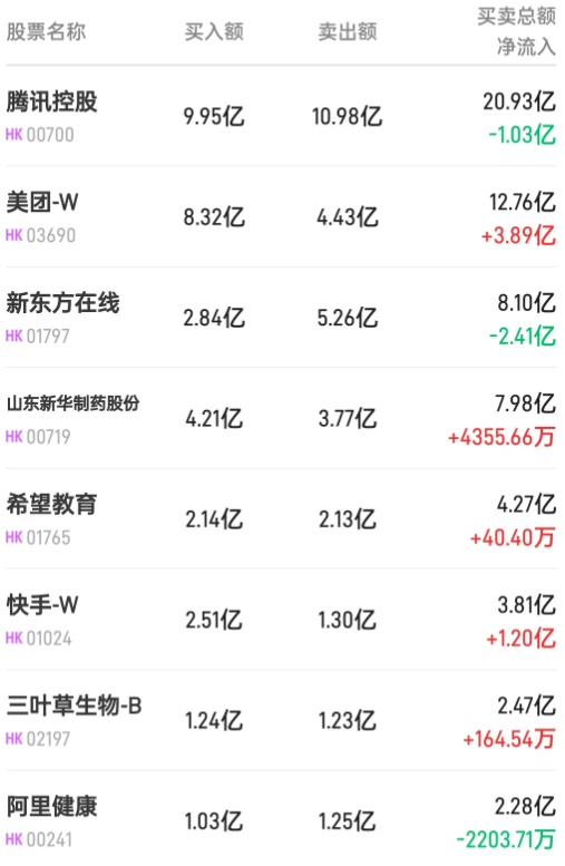 北水净买入最多的个股是美团-W(03690)、山东新华制药(00719)、腾讯(00700)。北水净卖出最多的个股是中国移动(00941)、金沙中国(01928)、阿里健康(00241)。