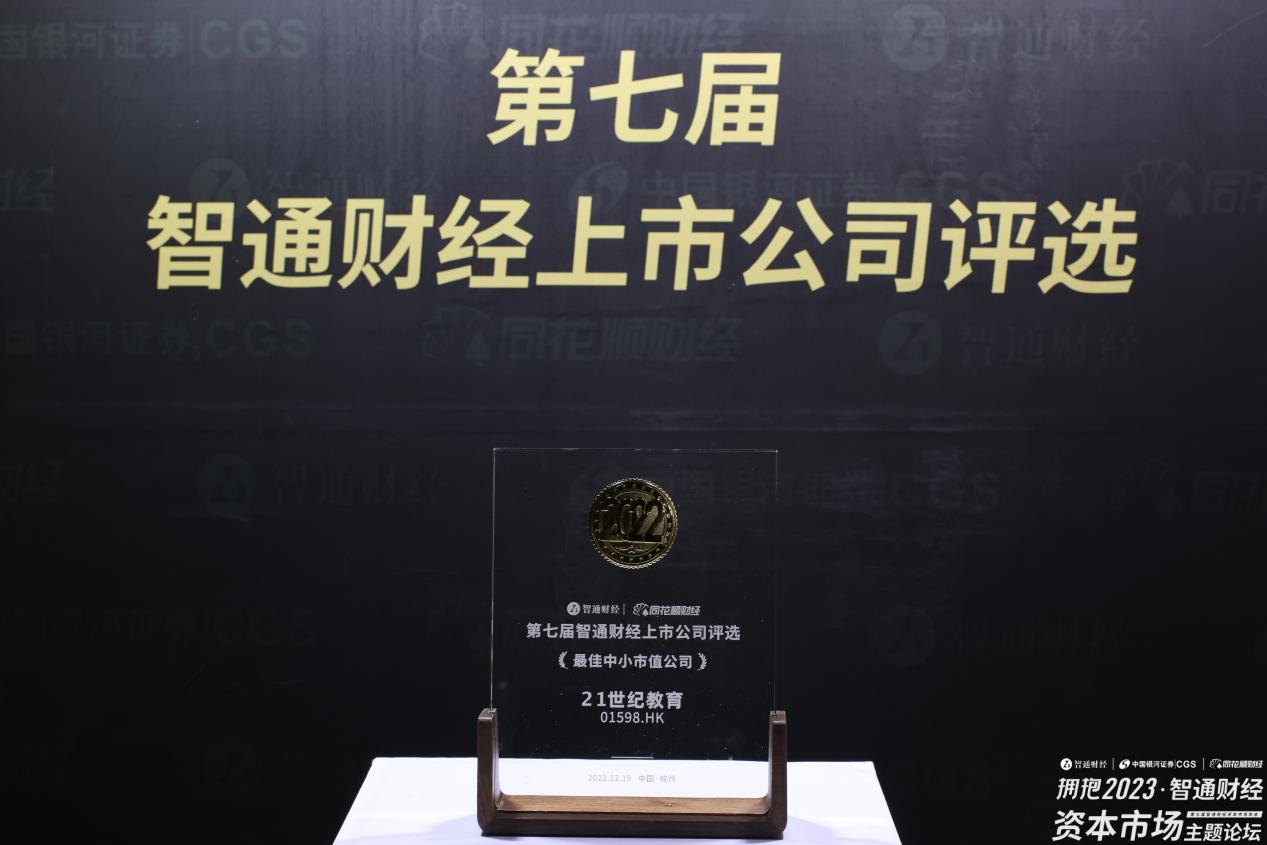 据了解,第七届金港股上市公司评选活动,由智通财经、同花顺财经及中国银河证券及|CGS共同主办,主题为“拥抱2023·第七届智通财经资本市场年会”,集合了投行及第三方专业机构,专业阵容强大。21世纪教育此次入选“最佳中小市值公司”,充分说明其价值已获得市场及专业机构认可。集团董事会秘书杨洋出席了第七届智通财经资本市场年会,并代表公司获取殊荣。