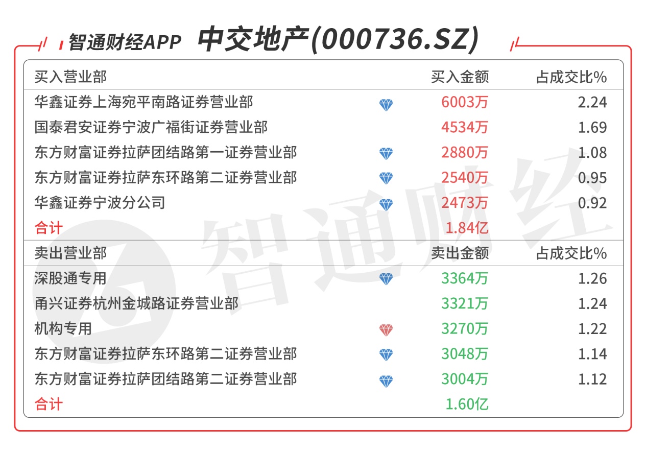 中交地产(000736.SZ):龙虎榜阵容豪华,机构与游资出现分歧,机构席位卖出3270万元,深股通对倒卖出1242万元,买一是顶级游资炒股养家的席位买入5926万元,买二是顶级游资章盟主的席位买入4465万元,买五是知名游资的席位买入2473万元,当日净买入3867万元,该股近期持续走强,强势特征明显。