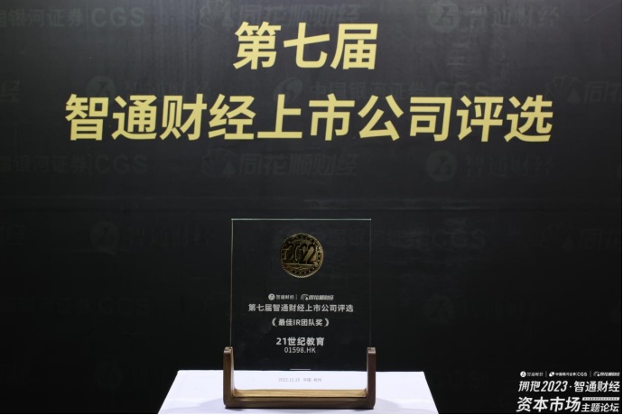 2022年12月19日,由智通财经、同花顺财经及中国银河证券及|CGS共同主办,主题为“拥抱2023·第七届智通财经资本市场年会”在杭州隆重举行,21世纪教育(01598.HK)在此次评选中获得了“最佳IR团队奖”的殊荣。据了解,此次奖项旨在表彰公司不断规范运作、完善治理结构,标志着投资者高度认可公司的整体战略,以及在合规、透明、高效的信息披露方面的优秀表现,打造了诚信互利氛围,树立了公开、透明的上市公司形象。集团董事会秘书杨洋先生代表公司IR团队领取奖项,同时表示团队将始终坚持高质量传递公司价值。