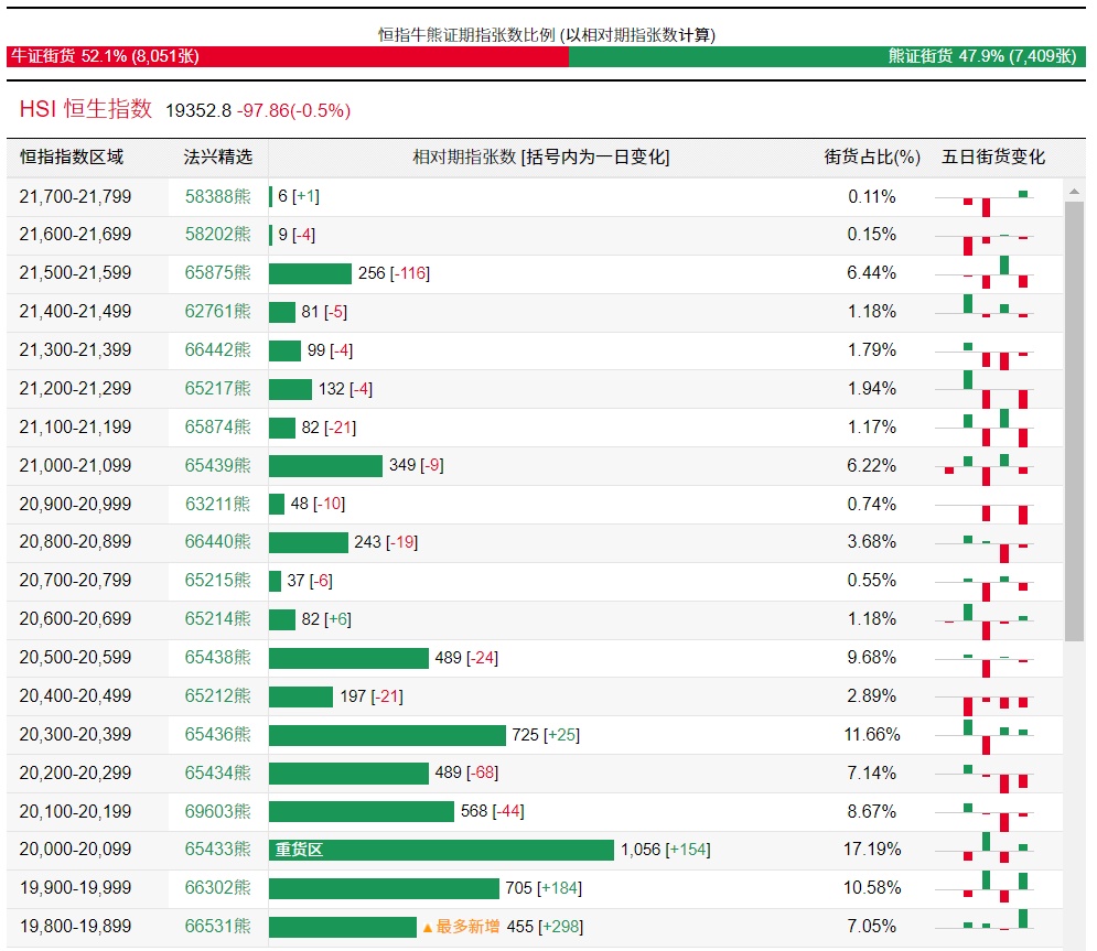 法兴恒指牛熊证街货分布图中的数据显示,熊证街货重货区在20000-20099区间,该区间最新熊证数量为1056张,较上一交易日增加154张;最多新增在19800-19899区间,该区间最新熊证数量为455张,较上一交易日增加298张;。