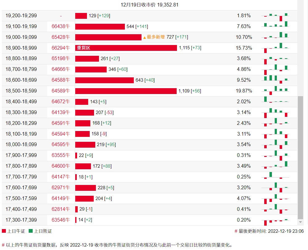 牛证街货重货区在18900-18999区间,该区间最新牛证数量为1115张,较上一交易日增加73张;最多新增在19000-19099区间,该区间最新熊证数量为727张,较上一交易日增加171张;。