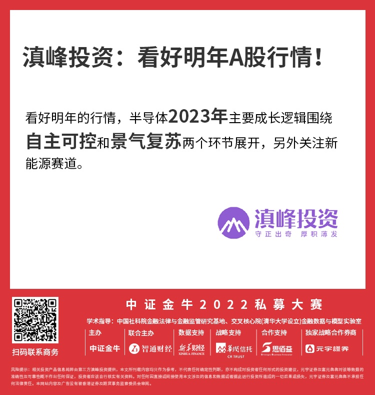 智通财经APP获悉,由元宇证券独家战略支持的中证金牛2022私募大赛于12月1日正式启动,赛事正如火如荼开展。近期不少参赛机构研究团队及产品主理人就市场走势和行业展望发表真知灼见。广东滇峰私募基金管理有限公司表示,看好明年A股行情!半导体2023年主要成长逻辑围绕自主可控和景气复苏两个环节展开,另外关注新能源赛道。