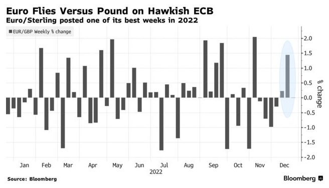 12月,英国央行和欧洲央行都将利率上调了50个基点,然而前者已经有两名投票成员呼吁暂停加息周期,而后者在做出决定之后,众多政策制定者一致表示,利率将不得不上调至超出市场预期的水平。这促使欧元兑英镑上周上涨1.4%,创下一个月来的新高。
