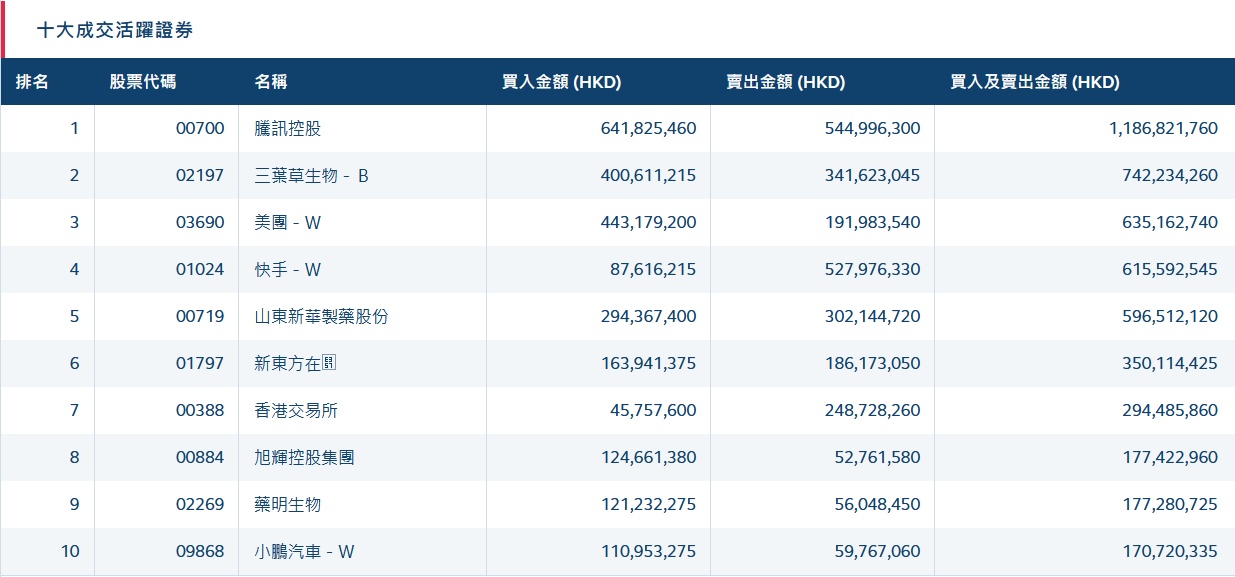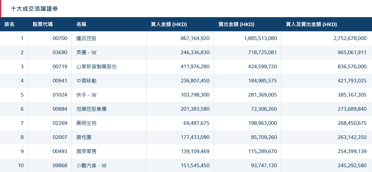 北水净买入最多的个股是旭辉控股集团(00884)、小鹏汽车-W(09868)、碧桂园(02007)。北水净卖出最多的个股是腾讯(00700)、港交所(00388)、山东新华制药(00719)。