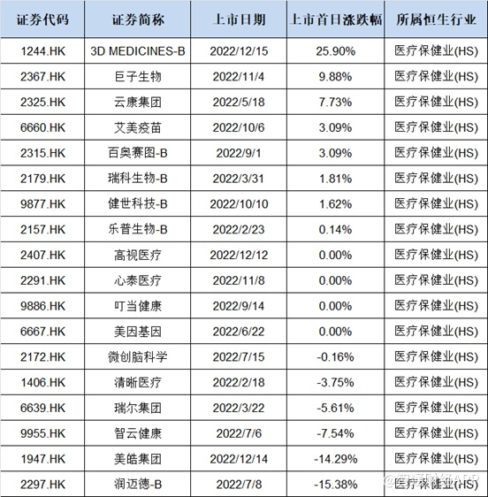 今年以来,港股的生物医疗企业上市首日表现一般,据wind数据显示,年初至今共有18家生物医药企业上市,首日收涨的仅8家,表现最好的为近日刚上市的3DMEDICINES-B(简称思路迪,01244)涨幅为25.9%。