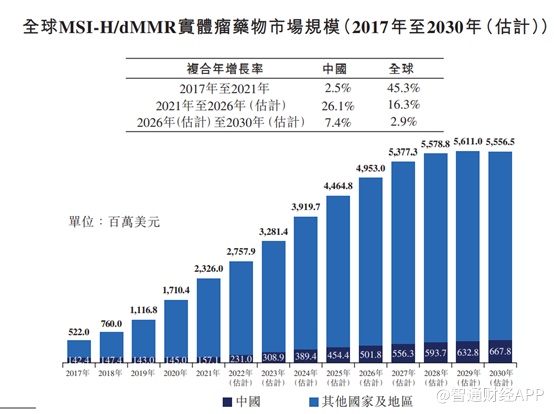 泛癌性质推动MSI-H/dMMR药物全球市场及中国市场的增长。弗若斯特沙利文数据显示,全球市场中,2021年全球MSI-H/dMMR肿瘤药物市场规模达23.26亿美元,预期于2026年将达到49.53亿美元,2021年至2026年的复合年增长率为16.3%,并进一步增至2030年的55.57亿美元。中国市场中,2021年中国MSI-H/dMMR肿瘤药物市场规模为1.57亿美元,预期于2026年将达到5.02亿美元,2021年至2026年的复合年增长率为26.1%,于2030年将进一步达到6.68亿美元。泛癌性质将推动全球及中国MSI-H/dMMR肿瘤药物市场的增长。