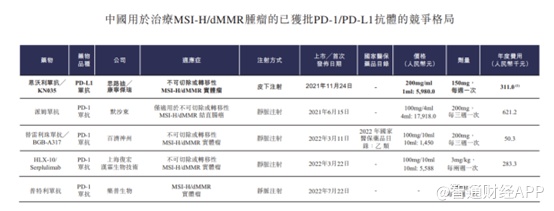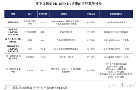 从产品角度来看,思路迪产品无非为当前市场上最热门的PD-1,市场竞争极为激烈,截至最后实际可行日期,全球市场上合计有19款获批上市的PD-1/PD-L1单克隆抗体抑制剂,其中14款靶向PD-1及5款PD-L1。其中18款均为通过静脉注射的传统抗体,与这些PD-1所不一样的是,思路迪的恩沃利单抗采用的是皮下注射方式。对患者而言皮下注射给药方式更加便利,可提高患者依从性及扩大患者覆盖范围。就针对先前接受过治疗的MSI-H/dMMR晚期实体瘤的适应症而言,恩沃利单抗为首款且唯一一款在中国接受针对泛瘤种的BLA阶段皮下注射PD-1/PD-L1抑制剂。