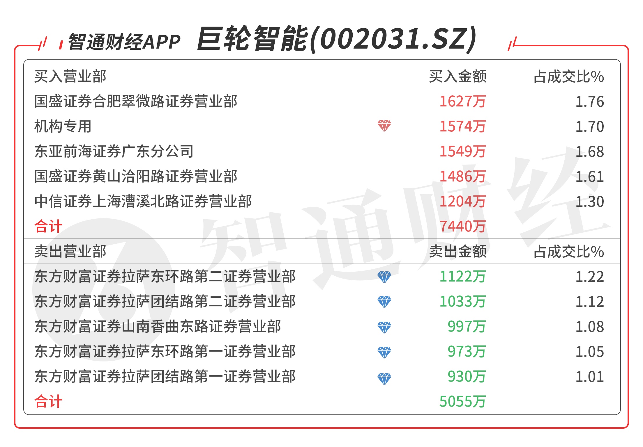 巨轮智能(002031.SZ):多主力现身龙虎榜,机构席位买入1440万元,买三是知名游资的席位买入1549元,当日净买入6298万元,该股近日底部出现N型涨停,有望冲击半年线。