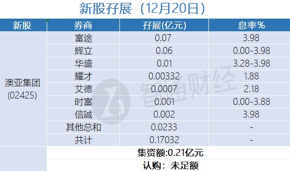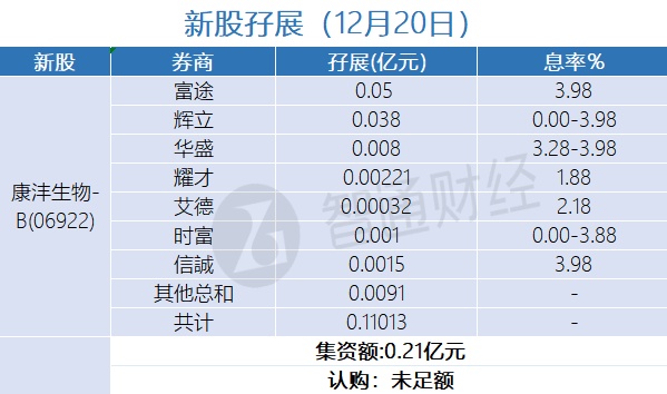 智通财经APP获悉,康沣生物(06922)、澳亚集团(02425)、博安生物(06955)正在招股中。截至12月20日,富途、辉立、华盛、耀才等合计分别借出孖展0.11013亿、0.17032亿、 0.05125亿港元,三者皆为未足额认购。