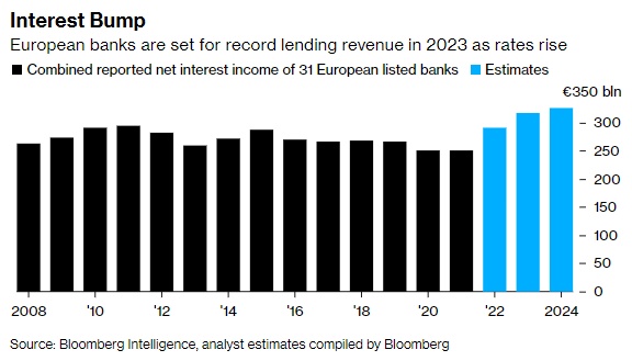 不过,就目前而言,欧洲央行货币政策的迅速逆转不仅提高了欧洲银行的贷款收入;它还扩大了过去三年推动大型投资银行交易业绩的市场波动。