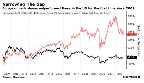 这种差异给欧洲银行带来了罕见的优势,它们的股价自2009年金融危机结束以来首次跑赢美国同行的指数。