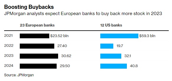 这一业绩也反映出市场预期,即欧洲银行明年将能够通过回购支付更多资金。以Kian Abouhossein为首的摩根大通分析师预计,欧洲各银行明年总共将斥资306亿美元回购股票,较两年前增加30%。相比之下,美国公司的回购预计仍将远低于2021年的水平。