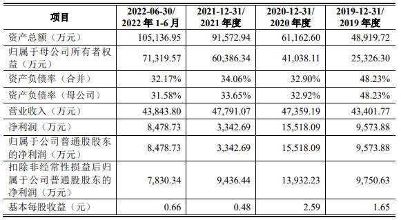 财务方面,于2019年度、2020年度、2021年度,公司实现营业收入约为4.34亿元、4.74亿元、4.78亿元。净利润分别约为9573.88万元、1.55亿元、3342.69万元。