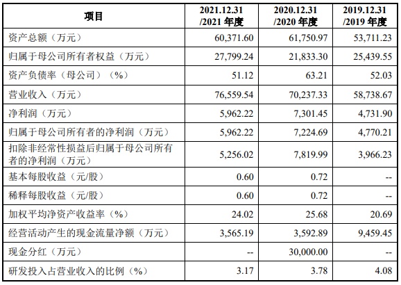 财务方面,于2019年度、2020年度、2021年度,公司实现营业收入约为5.87亿元、7.02亿元、7.66亿元。净利润分别约为4731.90万元、7301.45万元、5962.22万元。