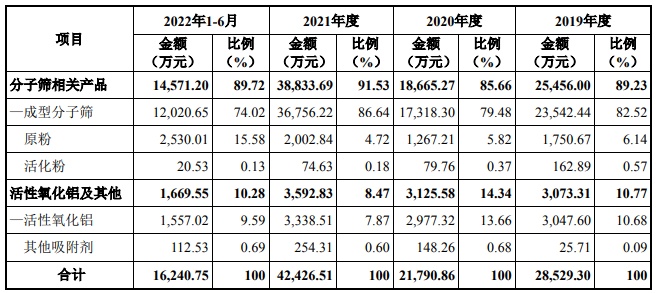 招股书显示,恒业微晶主要从事分子筛相关产品的研发、生产、销售和技术服务,主要产品包括分子筛原粉、分子筛活化粉及成型分子筛。公司的分子筛产品主要应用于吸附分离领域,下游应用领域广阔,全面覆盖工业制氧(深冷空分、变压吸附)、医用制氧、能源化工、石油化工、食品及医药包材、制冷等众多下游领域。