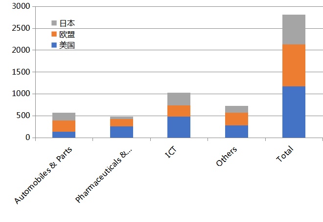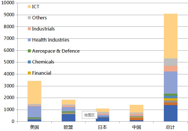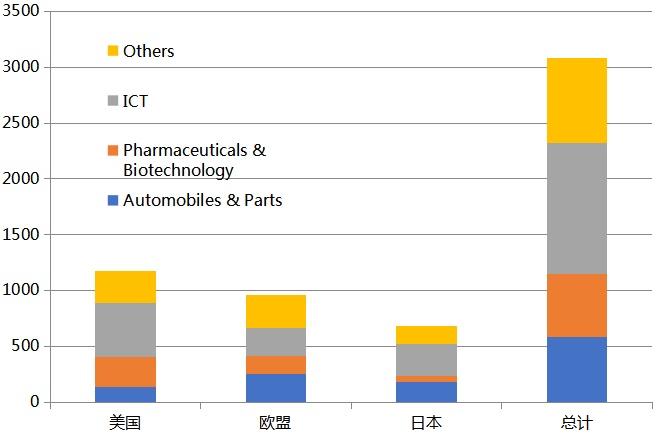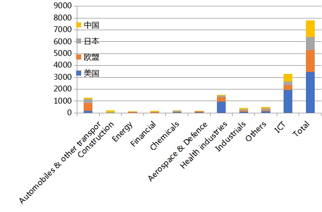 相较于其他行业,美国和中国的研发密集型公司在ICT行业进行了更多的研发投入,而欧盟和日本的研发密集型公司则在ICT行业的研发投入不断减弱。
