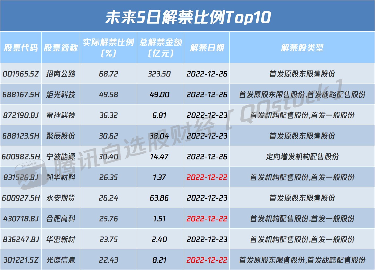 从解禁比例来看,未来5日招商公路解禁比例达68.72%,其次解禁比例居前的分别为炬光科技、雷神科技;从解禁市值来看,招商公路、永安期货等股解禁市值居前。