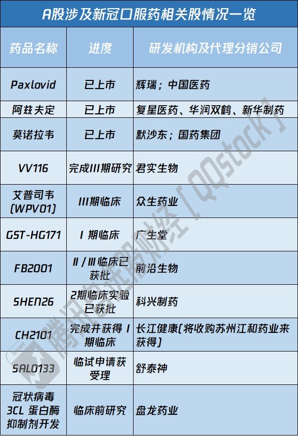 自选股梳理上市公司公告等发现,除信立泰之外,A股此前有中国医药、复星医药、君实生物、众生药业、广生堂、前沿生物、科兴制药等有研发或者代理分销新冠口服药的相关进展。