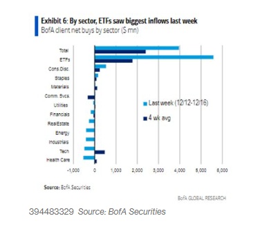 自2017年以来,在连续五周单一美股买入之后,美银投资者向ETF累计投入的资金最多。截至12月16日当周,流出资金最多的是科技股板块,美银客户六周以来首次抛售科技股,其次是医疗保健股,而必需消费品和非必需消费品的资金流入最多,合计卖出标普500指数11个主要板块中的7个板块的股票。