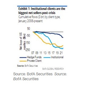 机构客户在2022年连续两年抛售股票后成为买家,而散户是美股的最大净买家,对冲基金是今年唯一的净卖家,美银数据显示今年美股股市出现自2008年以来最大的资金流出。