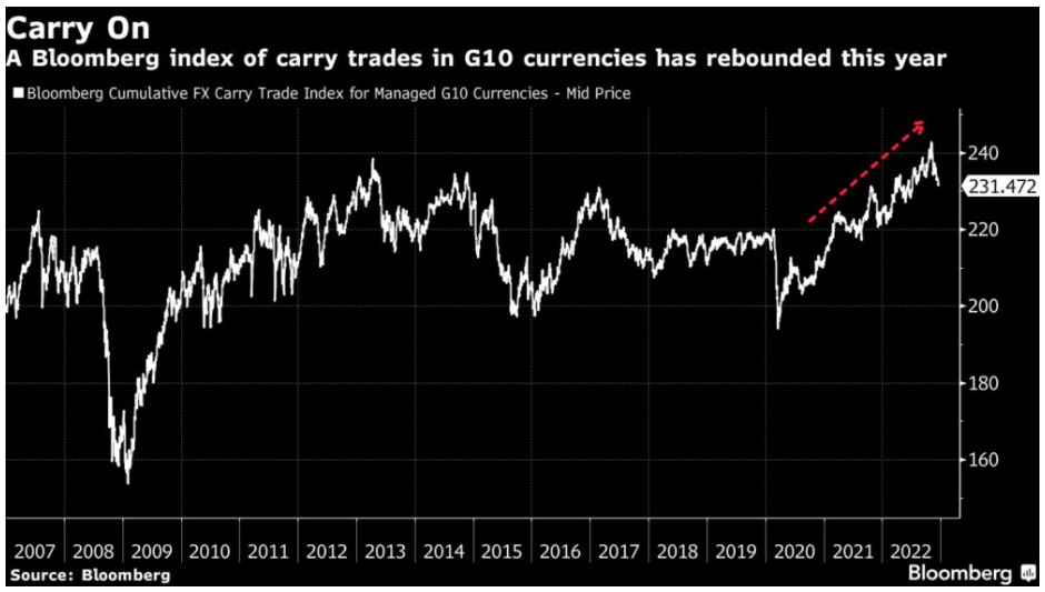 不过,目前尚不清楚全球金融体系中仍有多少日元套利交易。据说,自2008年金融危机以来,随着各大央行设定的利率趋近于零,套利交易已不再受欢迎。不过,今年此类交易可能再度复苏,因为在其他央行采取行动抑制通胀之际,日本央行仍在继续实施其收益率曲线控制(YCC)政策。