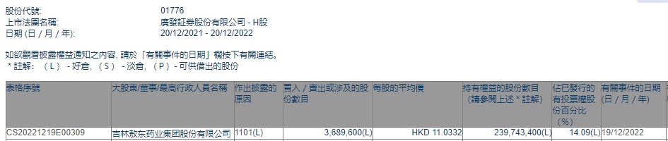 智通财经APP获悉,香港联交所最新资料显示,12月19日,吉林敖东药业集团股份有限公司增持广发证券(01776)368.96万股,每股作价11.0332港元,总金额约为4070.81万港元。增持后最新持股数目约为2.40亿股,最新持股比例为14.09%。