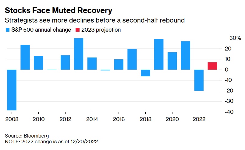 准备告别全球金融危机以来美股最糟糕一年的投资者,可能要为2023年上半年将发生的又一轮暴跌行情做好充足的准备工作。这一悲观的预期,可以说是摩根大通、摩根士丹利和高盛集团等华尔街投资机构的资深策略师达成的共识预期。