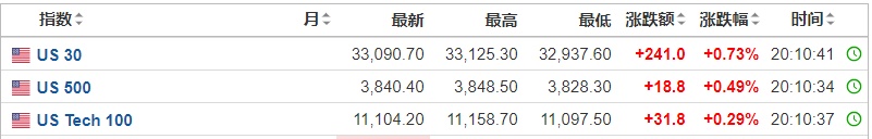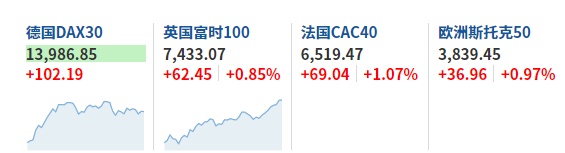 2. 截至发稿,德国DAX指数涨0.74%,英国富时100指数涨0.85%,法国CAC40指数涨1.07%,欧洲斯托克50指数涨0.97%。