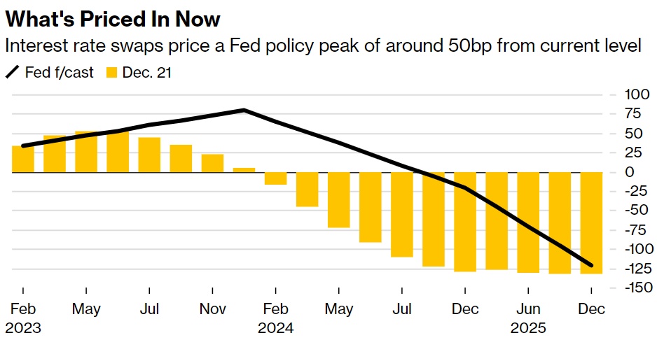 美联储上周在全年最后一次决策会议上将利率上调50个基点,使得基准利率的目标区间达到4.25%-4.5%。“点阵图”显示明年年底的利率预期中值为5.1%,高于上一轮4.6%的预期。然而,美联储会期对应的隔夜互换数据显示,到2023年5月份会议的加息幅度仅略高于50个基点,而到明年年底则将降息50个基点。