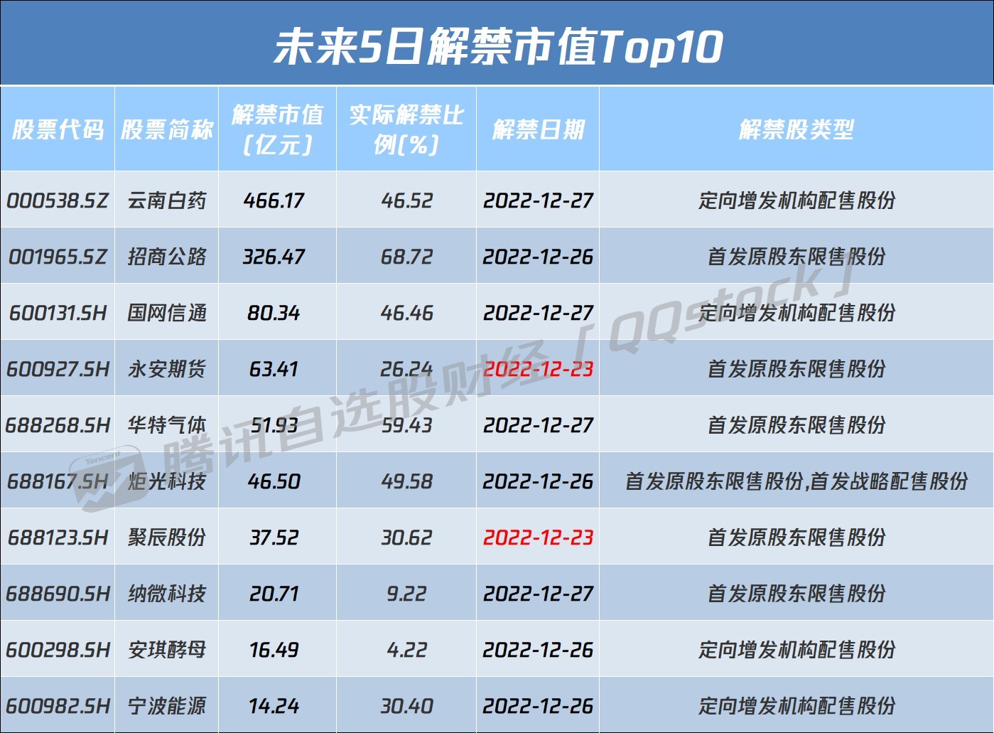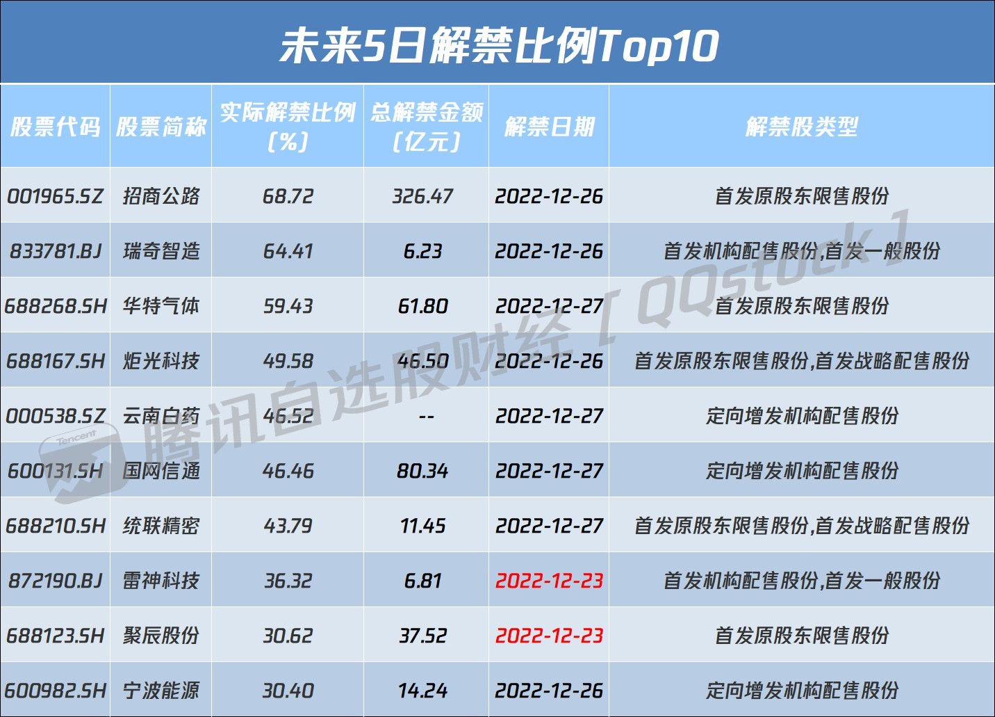 从解禁比例来看,未来5日招商公路解禁比例达68.72%,其次解禁比例居前的分别为瑞奇智造、华特气体;从解禁市值来看,云南白药、招商公路等股解禁市值居前。
