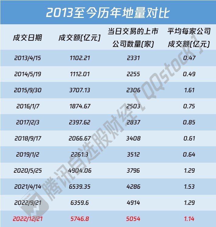 自选哥据市场公开数据梳理了,2013年至今历年的地量对比。其中,2015年9月30日虽是当年的地量,但分摊到每家公司的成交额为1.61亿元是历年来最高额。(注:本次统计,未考虑货币贬值、通货膨胀等因素,每家公司平均成交额数值也仅供参考)