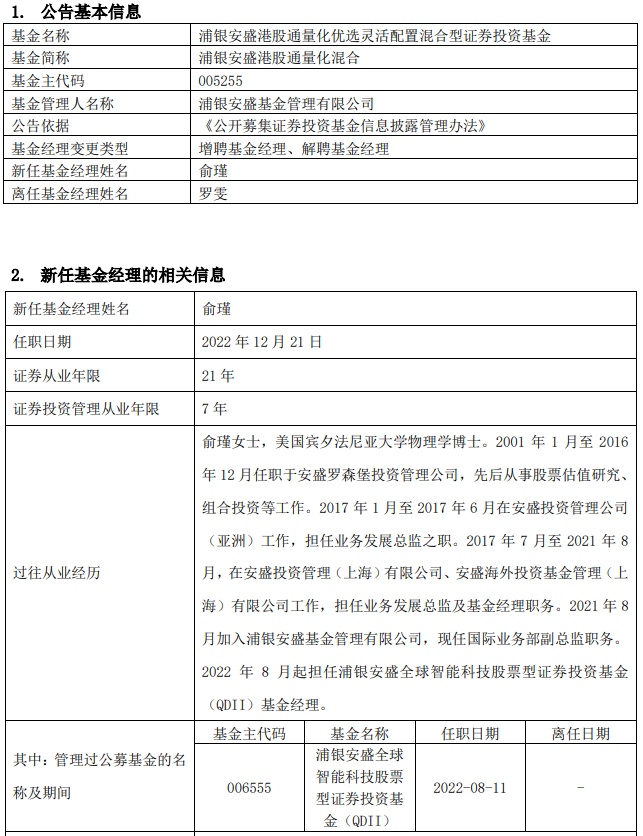 智通财经APP获悉,12月22日,浦银安盛港股通量化混合(005255)发布公告,增聘俞瑾为基金经理,任职日期自2022年12月22日起,罗雯不再担任该基金基金经理,离任日期为2022年12月22日,变更后浦银安盛港股通量化混合(005255)的基金经理为俞瑾。
