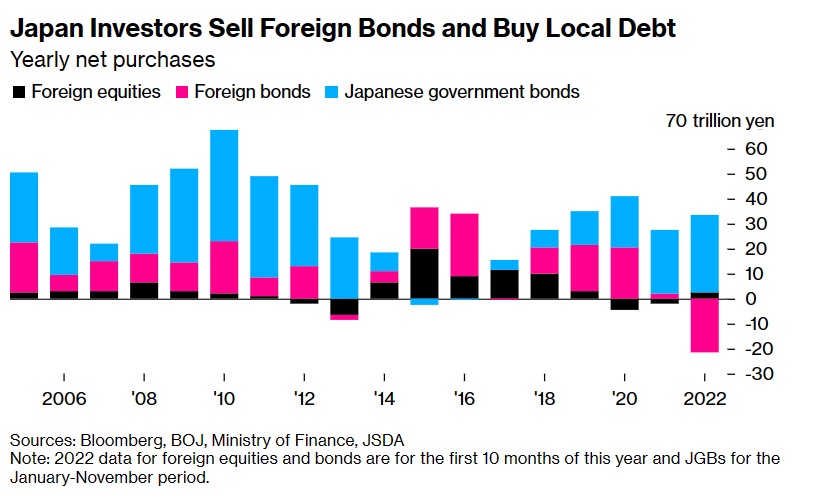 日本国内的投资者抛售外国债券,购买本国债券(年净购买量)
