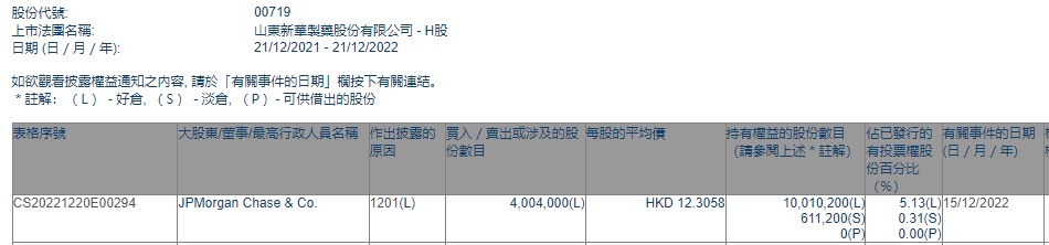 智通财经APP获悉,香港联交所最新资料显示,12月15日,小摩减持山东新华制药股份(00719)400.4万股,每股作价12.3058港元,总金额约为4927.24万港元。减持后最新持股数目约为1001.02万股,最新持股比例为5.13%。