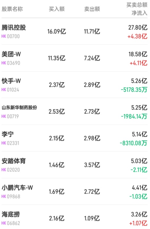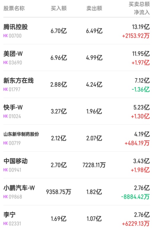 北水净买入最多的个股是美团-W(03690)、腾讯(00700)、中国移动(00941)。北水净卖出最多的个股是小鹏汽车-W(09868)、中国海油(00883)、李宁(02331)。