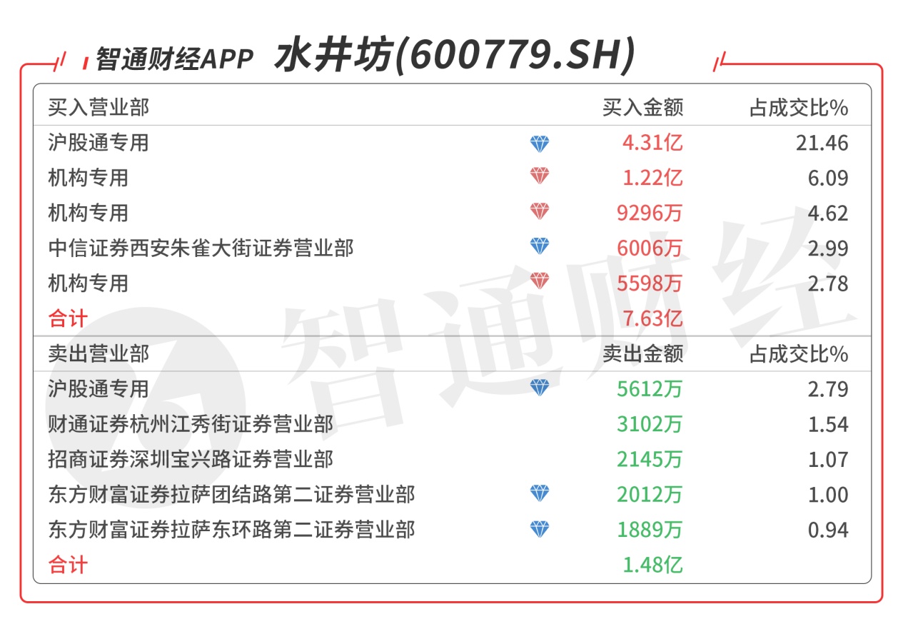 水井坊(600779.SH):受到众多机构青睐,今日共3个机构席位出现在龙虎榜单上,合计净买入2.71亿元,沪股通对倒净买入3.75亿元,买四是顶级游资方新侠的席位买入6006万元,当日净买入6.15亿元,该股今日突破所有均线,有望冲击前期高点。