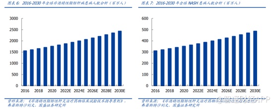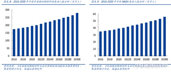 在过去十几年中,NAFLD发病率在亚洲国家增长迅速,根据国家药监局发布的《非酒精性脂肪性肝炎治疗 药物临床试验技术指导原则》,我国普通成人B型超声诊断的NAFLD患病率在10年期间从 15%增加到 31%以上,在我国发达省份,成人患病率已达到29.2%。我国NAFLD发病率已超过了全球的发病率。我国非酒精性脂肪肝病患病人数同样呈上升趋势。从 2016 年的1.7亿人上升到 2021年的接近 2.0 亿,年复合增长率为 2.9%;伴随着人口老龄化程度及肥胖、糖尿病患病率等的增加,中国非酒精性脂肪肝病患病率会以更快的速度增长,预计在2022年将突破2亿,于2030年达到2.8亿人。中国NASH患病人数呈上升趋势,预计在2022年突破4000万人,2030 年将突破5000万人。