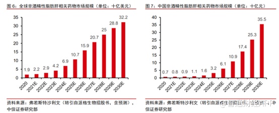 据弗若斯特沙利文报告,全球非酒精性脂肪肝病相关药物的市场规模2020年约19亿美元,预计将快速增长至2030年的322亿美元;在我国,非酒精性脂肪肝患病率已超过全球患病率,相关药物市场规模预计将从2020年的7亿元增长至2030年355亿元人民币,2020-2025 和2025-2030年间的复合年增长率分别为37%和61.4%。