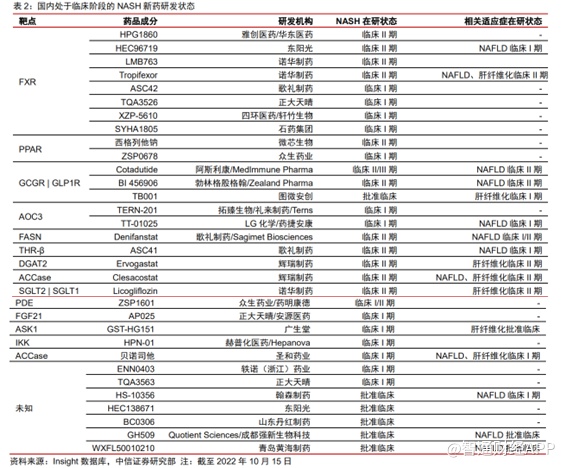 百亿蓝海市场,引得国内药企纷纷布局。据Insight 数据库统计,国内处于临床阶段的NASH 药物共32款,其中25款为国内药企负责开发,研究靶点琳琅满目,FXR激动剂扎堆明显。