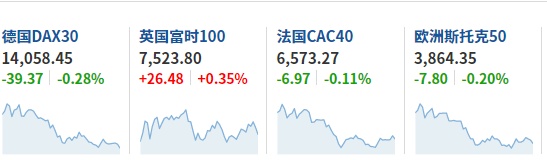 2. 截至发稿,德国DAX指数跌0.28%,英国富时100指数涨0.35%,法国CAC40指数跌0.11%,欧洲斯托克50指数跌0.20%。
