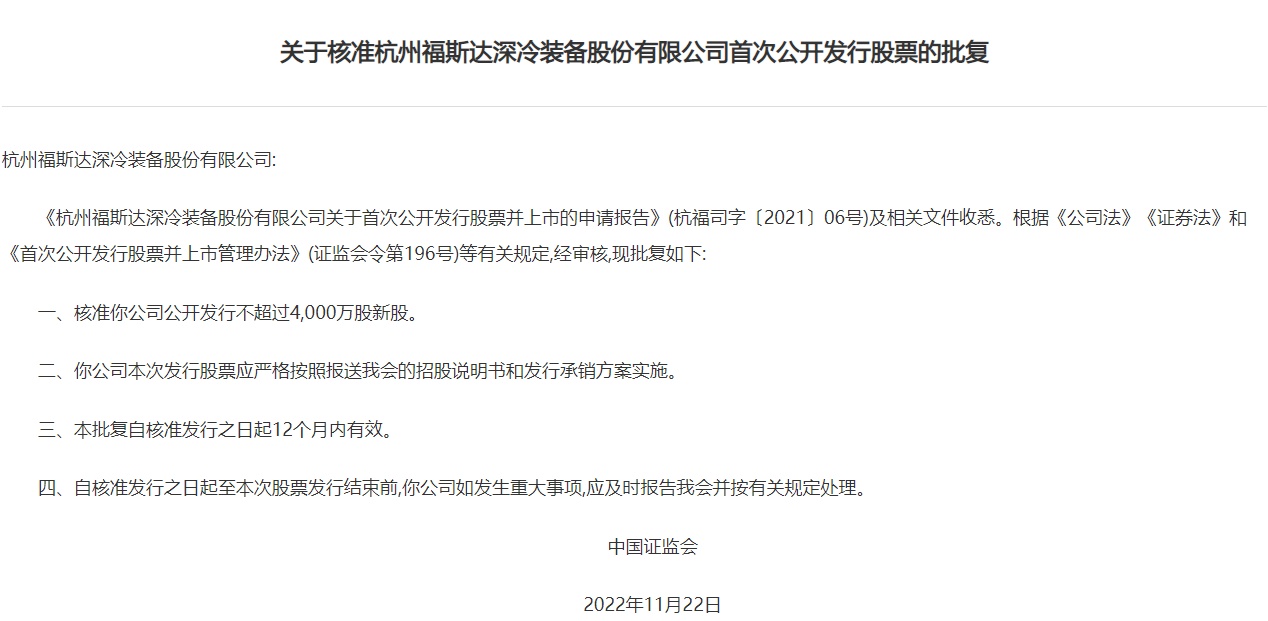 智通财经APP获悉,12月22日,中国证监会网站发布关于核准杭州福斯达深冷装备股份有限公司首次公开发行股票的批复。民生证券为其保荐机构,拟募资7.5亿元。募集资金的主要用途包括年产15套大型深冷装备智能制造项目、研发中心建设项目以及补充流动资金等方面。
