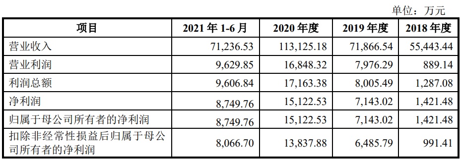 财务方面,于2018年、2019年、2020年和2021年上半年,福斯达营业收入分别为5.54亿元、7.19亿元、11.31亿元和7.12亿元;净利润分别为1421.48万元、7143.02万元、1.51亿元和8749.76万元。
