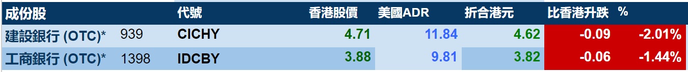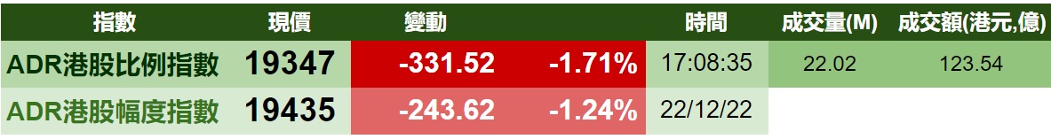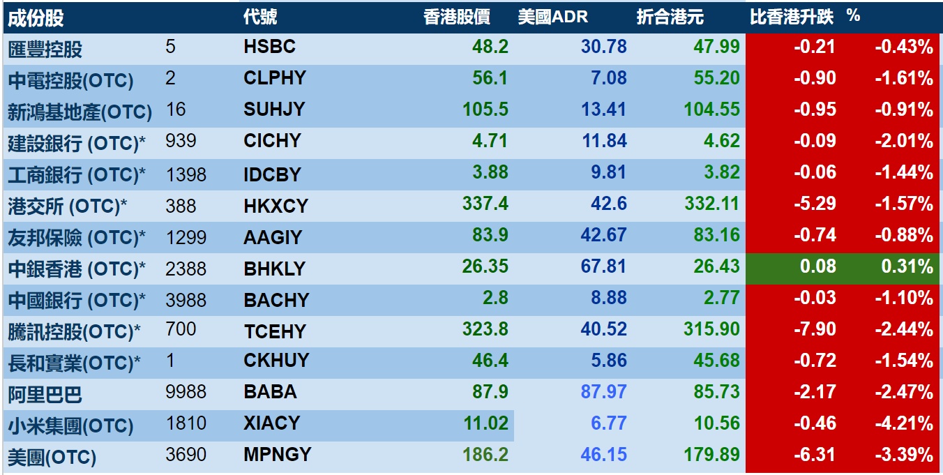 智通财经APP获悉,周四美股三大指数集体收跌,港股ADR指数下跌,按比例计算,收报19347点,较香港收市跌331.52点或1.71%。