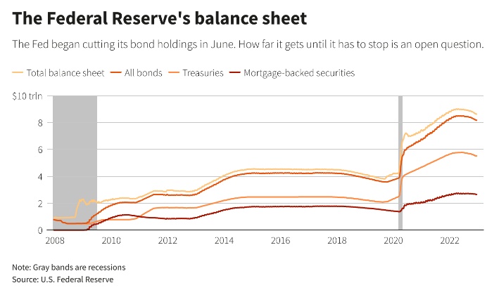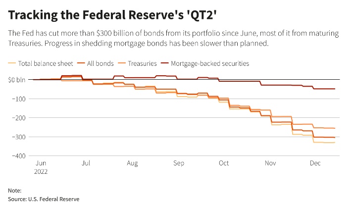 自今年夏天以来,美联储一直在缩减债券持有量,这是其提高借贷成本的更广泛努力的一部分,以帮助减缓经济增长,并将通胀从上世纪80年代以来的最高水平降下来。虽然官员们没有给出这一过程的结束日期,但经济学家们猜测,官员们预计这一过程将持续两年左右。