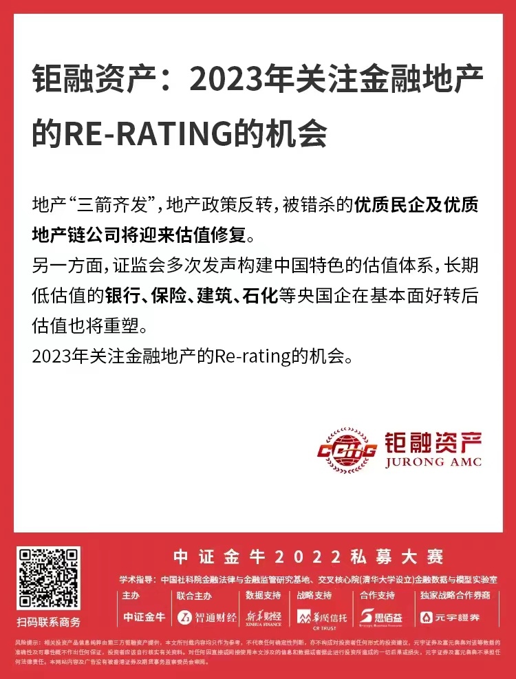 智通财经APP获悉,由元宇证券独家战略支持的中证金牛2022私募大赛于12月1日正式启动,赛事正如火如荼开展。近期不少参赛机构研究团队及产品主理人就市场走势和行业展望发表真知灼见。中海外钜融资产管理集团有限公司指出,2023年关注金融地产的重估机会。