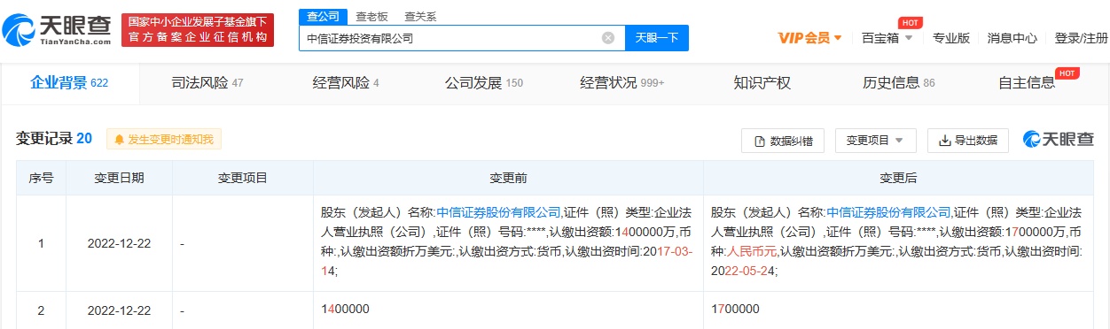 智通财经APP获悉,天眼查APP显示,近日,中信证券投资有限公司发生工商变更,注册资本由140亿人民币增至170亿人民币,增幅约21.43%。股东信息显示,该公司由中信证券股份有限公司全资持股。据公开资料显示,该公司成立于2012年4月,法定代表人为方浩,经营范围含金融产品投资,证券投资,股权投资。