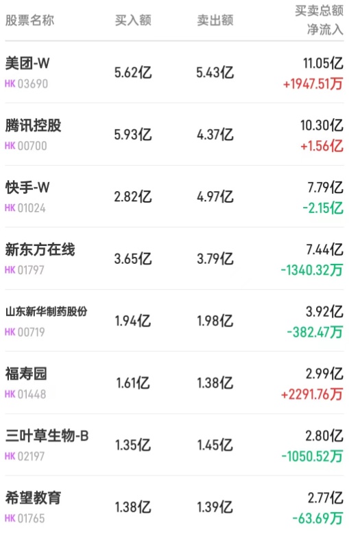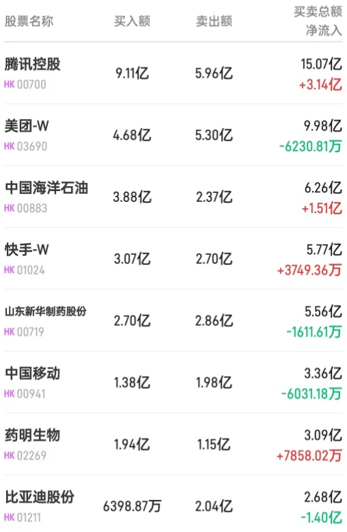 腾讯(00700)获净买入4.7亿港元。消息面上,大和发布研报称,予腾讯控股“买入”评级,比预期更早推出主要游戏,以及优于预期的视频号收入会成股价动力,目标价400港元。国泰君安表示,传媒板块的表现好于大盘。其中互动媒体与服务行业涨幅为7.5%,该行认为主要是得益于腾讯的出海游戏成绩优异以及视频平台的降本增效效果显著。该行认为,随着腾讯重夺龙头第一的地位,对游戏板块的成长性有了新的期待,建议重新关注具有自研自发能力的游戏龙头公司。