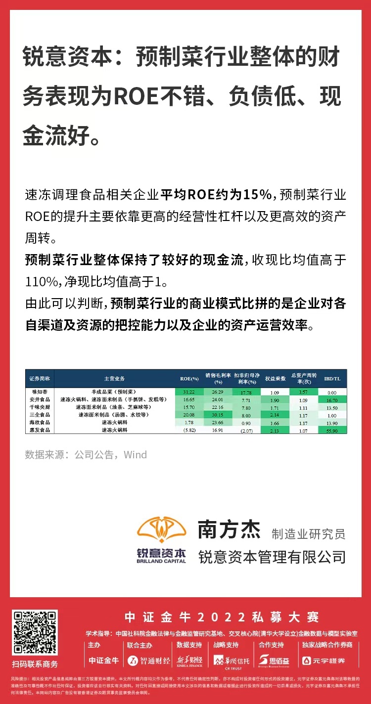 智通财经APP获悉,由元宇证券独家战略支持的中证金牛2022私募大赛于12月1日正式启动,赛事正如火如荼开展。近期不少参赛机构研究团队及产品主理人就市场走势和行业展望发表真知灼见。深圳市前海锐意资本管理有限公司制造业研究员南方杰指出,预制菜行业整体的财务表现为ROE不错、负债低、现金流好。速冻调理食品相关企业平均ROE约为15%,预制菜行业ROE的提升主要依靠更高的经营性杠杆以及更高效的资产周转。